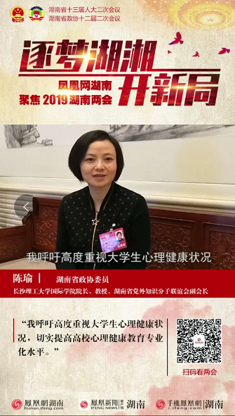 近日,湖南省政协委员、湖南省党外知识分子联谊会副会长、云顶国际vip8866国际学院院长陈瑜教授在湖南省“两会”期间接受了凤凰网的专访。陈瑜通过深入调研,阐述了当前我省大学生心理健康教育的基本现状,介绍了云顶国际vip8866心理健康教育工作的基本经验,提出了进一步提升大学生心理健康水平的系列建议。她呼吁,政府、社会和高校要高度重视大学生心理健康状况,切实提高高校心理健康教育专业化水平。据悉,陈瑜教授代表教育届政协委员在联组会议上发言时提出了上述建议,获得了省领导和教育厅领导的肯定的关注。(文/陈竹 审/成华)
