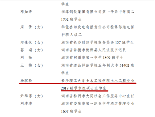 此外,经管学院国际经济与贸易专业2015级本科生刘欢、交通学院道路工程专业2016级本科生冯心崚获评“湖南省优秀共青团员”。