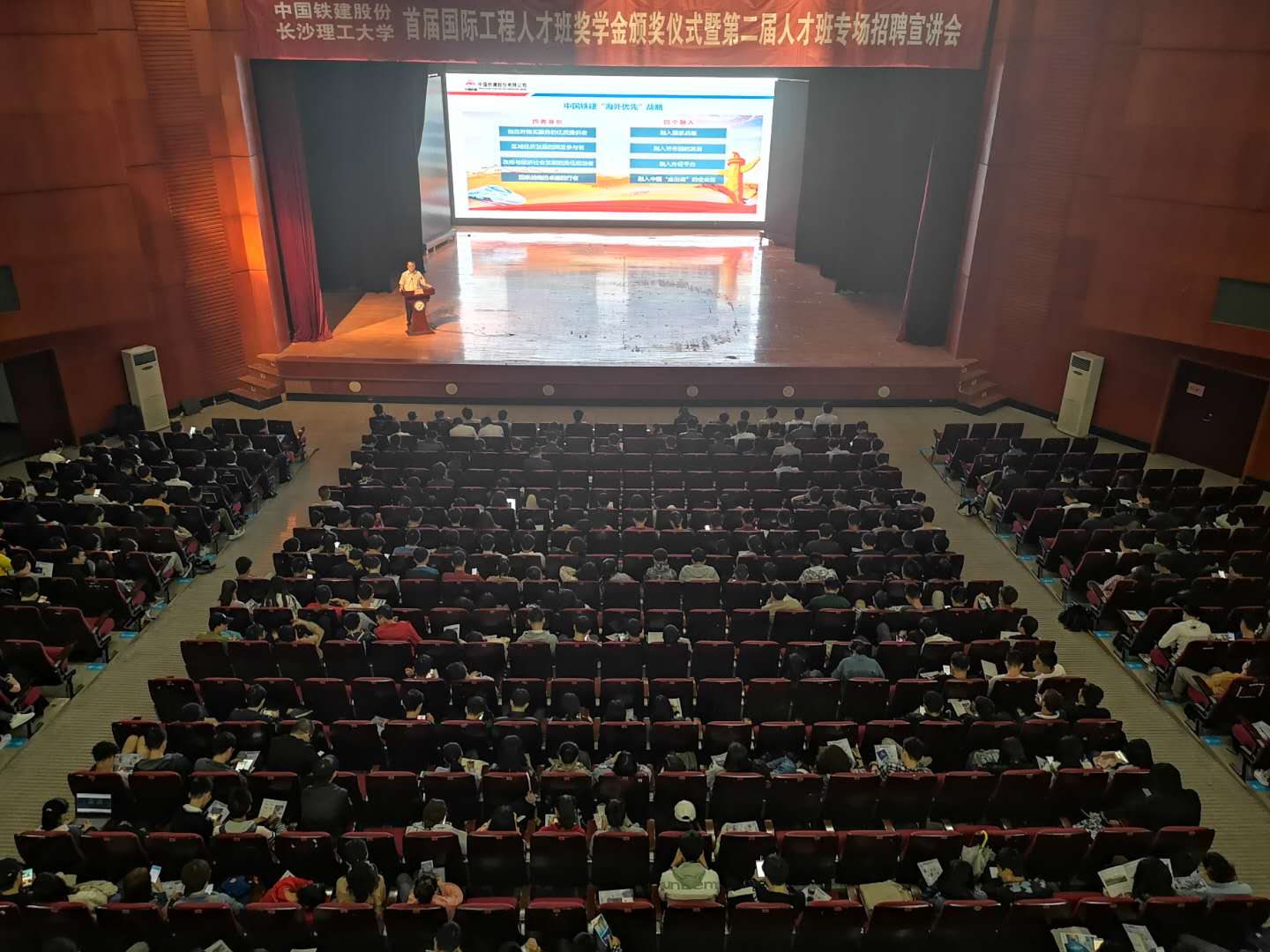 13日19时,宣讲会在云塘校区大会堂举行。副校长蒋昌波,中国铁建人力资源部人事处处长王谐出席宣讲活动,中国铁建下属21家二级企业人力资源部领导、相关学院党委副书记、辅导员、首届国际人才班学生和700余名相关专业大三学生参加宣讲会。