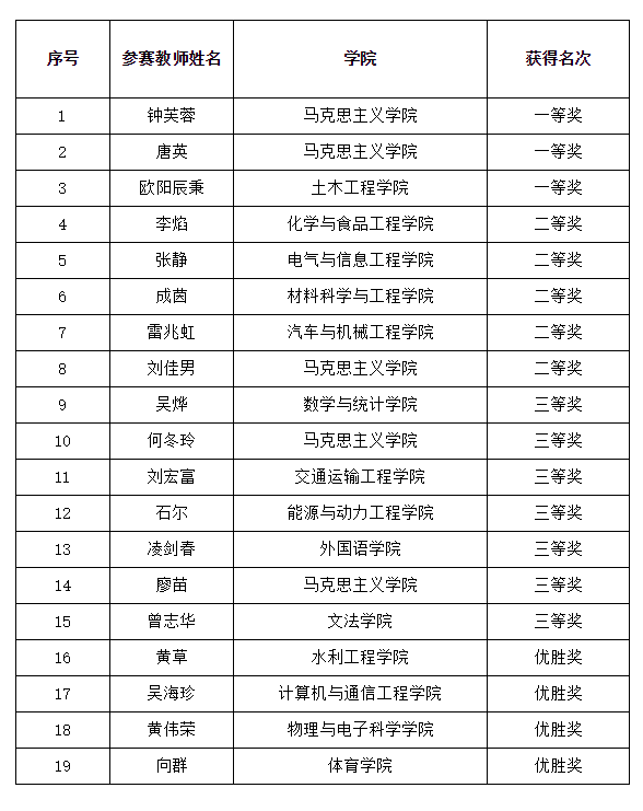 经过激烈比拼,马克思主义学院钟芙蓉等3位老师获得一等奖,化学与食品工程学院李焰等5位老师获得二等奖,数学与统计学院吴烨等7位老师获得三等奖,水利工程学院黄草等4位老师获得优胜奖 。