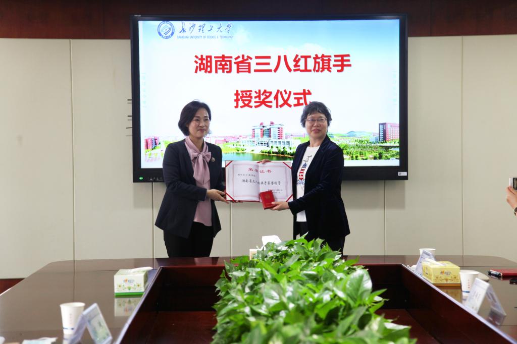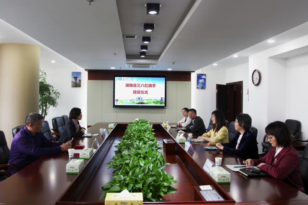 近日,湖南省妇联副主席方琼(挂职)、省妇联宣传部三级调研员刘伟东一行,专程为湖南省“三八红旗手”获奖者、云顶国际vip8866土木工程学院刘小燕教授授奖。党政办,校工会,土木工程学院主要负责人参加会议。