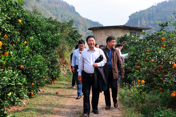 在生态脐橙园,曹一家调研了脐橙的丰收情况。当了解到村里的脐橙产量今年有望突破200万斤,但因为疫情不能出口有可能滞销的时候,曹一家现场和校工会、后勤中心等部门负责人商议,决定由工会和后勤中心在12月底之前共同完成200万元的采购任务,解决村里农副产品销售难题。