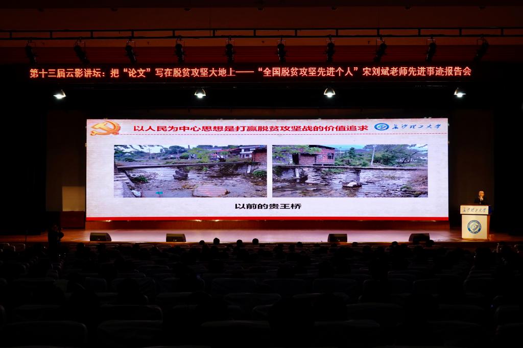 3月17日晚,第十三届研究生云影讲坛“把论文写在脱贫攻坚大地上”暨“全国脱贫攻坚先进个人”宋刘斌先进事迹报告会在金盆岭校区五教大礼堂举行。“全国脱贫攻坚先进个人”、云顶国际vip8866扶贫工作队队长宋刘斌,保卫处副处长、原扶贫工作队队员黄伟,扶贫工作队队员彭怡峰,研究生院副院长兼研工部部长田上,研究生志愿支教队首任队长谢扬同学与近千名研究生参加此次报告会。