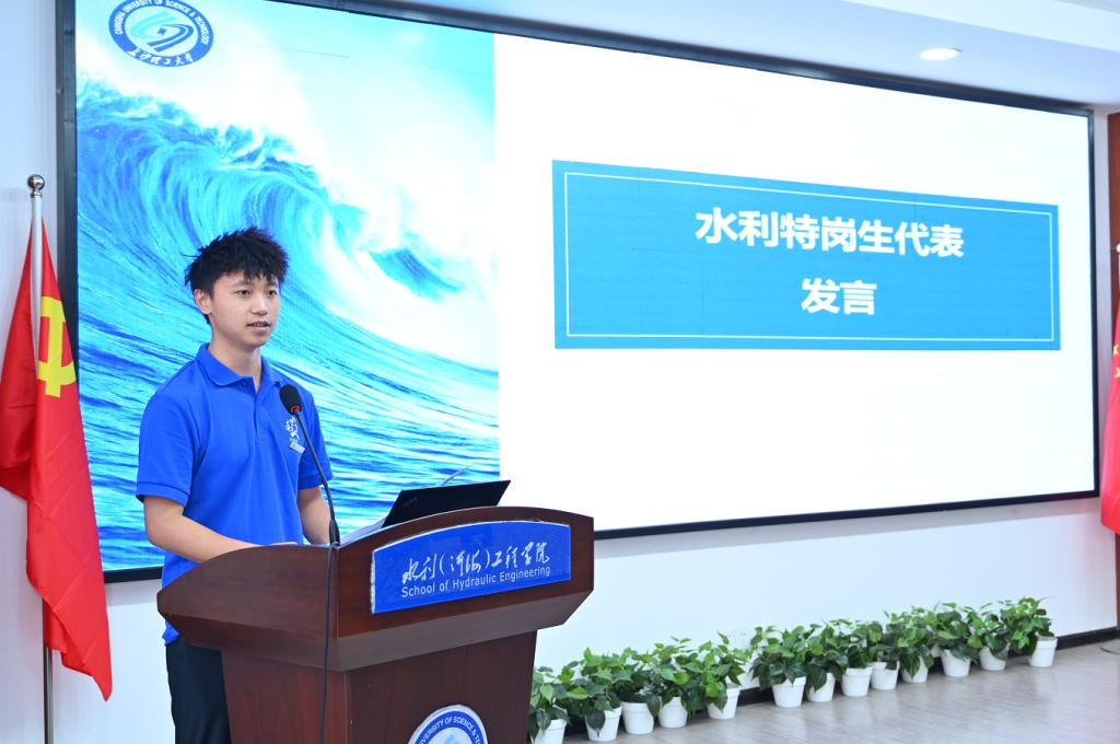 水文特岗2020级1班罗筱翔作为学生代表发言,表示将肩负起“爱水、为水、强水、兴水”责任使命,发扬水利特岗生“特别能担当、特别善务实、特别精钻研”精神,深学治水本领,不忘初心、牢记使命,争做湖南省第一批基层水利特岗计划的开拓者、奋进者。