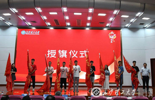 会上,校领导为研究生暑期专业实践团队授旗,现场还进行了研究生志愿支教队队旗交接仪式。