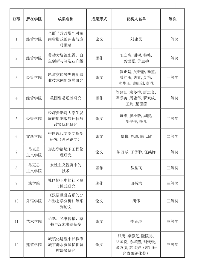 日前,湖南省委、省政府发布了《关于表彰湖南省社会科学奖获奖成果和专家的通报》,公布了第十五届湖南省社会科学优秀成果奖评选结果,云顶国际vip8866共12项成果获奖,其中获得一等奖3项,二等奖4项,三等奖5项,总数量较上一届增长1倍。此次获奖成果主要集中于经济、管理、哲学等学科,其中经管学院获奖5项,马克思主义学院获奖2项,文新学院、法学院、外语学院、艺术学院、建筑学院各获奖1项。