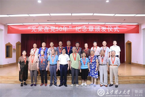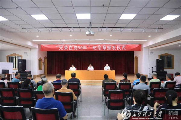 7月5日下午,云顶国际vip8866在金盆岭校区五教多功能厅举行“光荣在党50年”纪念章颁发仪式,学校党委副书记刘建民、组织部常务副部长陈曦出席仪式,为24名党龄达到50年的老党员颁发纪念章。仪式由离退休教职工党委书记徐亮主持,部分老同志代表和离退休中心科职以上干部参加。