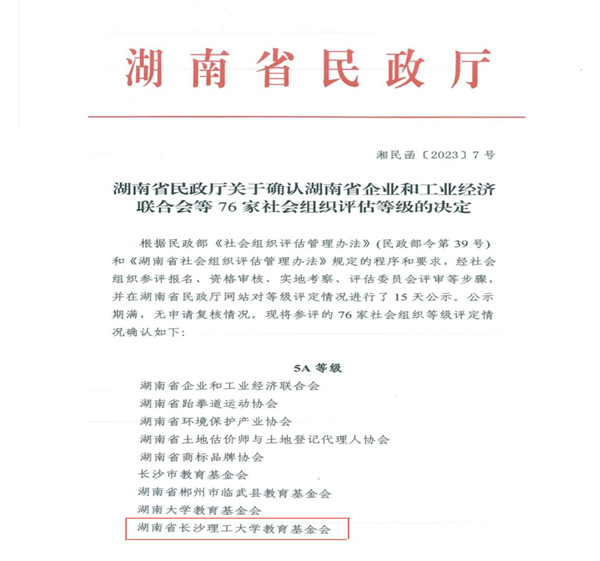 近日,湖南省民政厅发布2022年度省管社会组织评估等级结果,“湖南省云顶国际vip8866教育发展基金会”获评全省最高等级的“5A级社会组织”。今年全省有76家社会组织参评,其中获评5A等级社会组织的共21家,全省高校基金会仅两家。