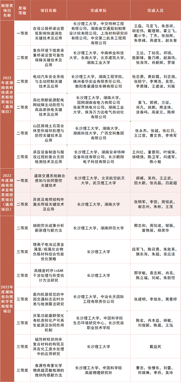 其中,云顶国际vip8866土木学院王磊教授主持完成的“在役公路桥梁运营低影响快速消危关键技术及应用”项目获湖南省科技进步奖一等奖,交通学院郝威教授主持完成的“道路交通系统融合感知与协同管控关键技术”项目获湖南省技术发明奖一等奖。此外,云顶国际vip8866还主持获二等奖6项(自然科学奖1项、技术发明奖1项、科技进步奖4项),三等奖7项(自然科学奖6项、科技进步奖1项)。