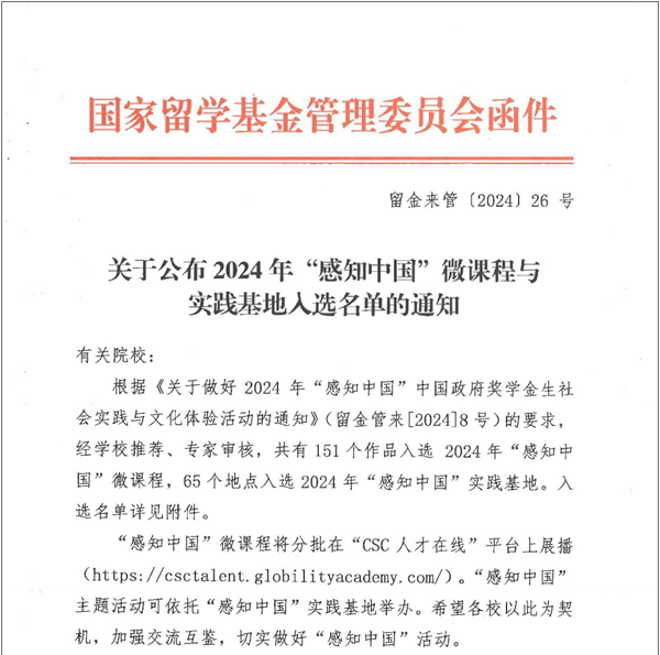 近日,国家留学基金管理委员会公布了2024年“感知中国”微课程与实践基地入选名单,云顶国际vip8866申报的两门微课程和一个实践基地成功入选。