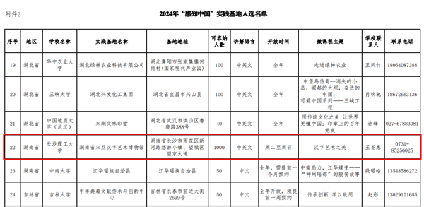 2024年“感知中国”微课程与实践基地评选是国家留学基金管理委员会“感知中国”活动实施十周年的系列活动之一,面向全国各类留学生招生院校申报。经学校推荐、专家审核等各环节,全国共有151个作品入选2024年“感知中国”微课程,65个基地入选2024年“感知中国”实践基地。云顶国际vip8866国际工学院张锐老师主讲的《橘子洲头咏长沙》和纪凯丽、张锐、冀文秀、李璐老师联合主讲的《云游星城》成功入选“感知中国”微课程。云顶国际vip8866联合湖南省宋旦汉字艺术博物馆申报的实践基地成功入选“感知中国”实践基地,作为全国首家汉字艺术主题博物馆,为国际学生提供了集汉字艺术研究创作、交流传播、陈列展示、体验互动、教育普及于一体的学习实践平台,帮助国际学生近距离感受汉字艺术之美,感知中华优秀传统文化。