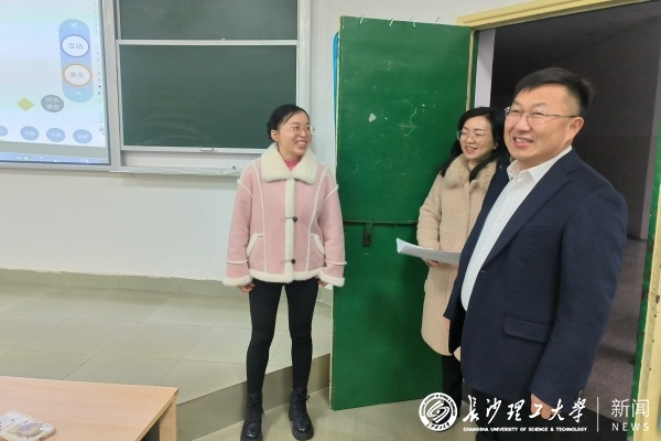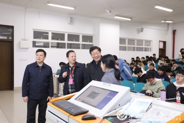 付宏渊一行先后来到综合教学楼的教师休息室、教室和视频监控室等地,并与师生亲切交流,重点了解教学设备运行、信息化技术应用、课堂秩序等情况。在视频监控室,付宏渊一行通过智慧系统实时查看了两校区百余间教室的教学情况。屏幕上,教师到岗率、学生出勤率、课堂互动情况一目了然。新学期第一堂课,教师们备课充分、授课认真,学生们专注听讲、积极互动,整体教学秩序井然,展现了长理人在新起点昂扬向上的精神风貌。