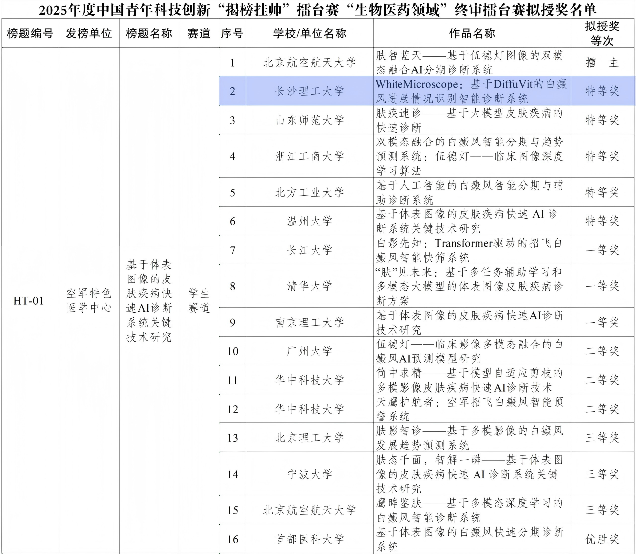 本次“生物医药领域”终审擂台赛聚焦生物医药科技前沿,围绕动物疫苗、生物发酵、合成生物等大方向发布15个榜题,精准覆盖“生物医药领域”多项技术瓶颈。由物电学院王新、王威老师指导的学生团队凭借“WhiteMicroscope:基于DiffuVit的白癜风进展情况识别智能诊断系统”,在清华大学、华中科技大学等全国顶尖高校组成的279支队伍中脱颖而出,成功斩获“生物医药领域”主擂台赛特等奖。