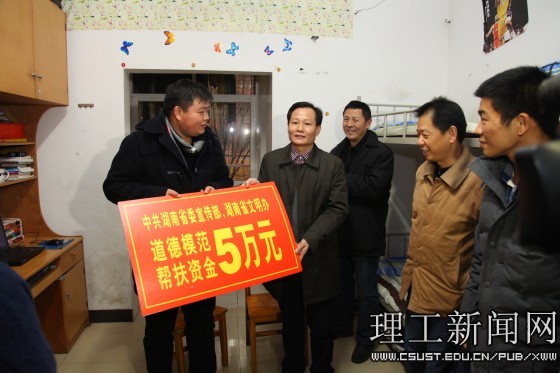 1月7日下午,湖南省委宣传部副巡视员唐贵平、省委教育工委宣传部副部长金望明与省文明办同志一行来云顶国际vip8866看望湖南省道德模范、全国道德模范候选人毕明哲同学,云顶国际vip8866副校长邹宏如,宣传部、学工部、校团委等部门领导和经管学院领导、老师代表陪同看望。唐贵平代表省委宣传部和省文明办给毕明哲同学送来了5万元道德模范帮扶资金。
