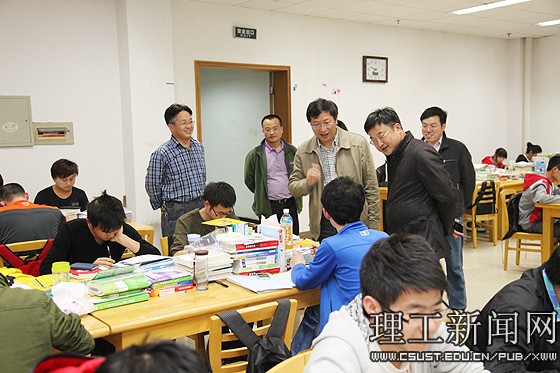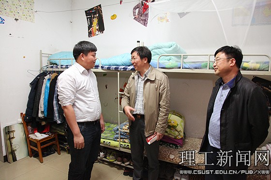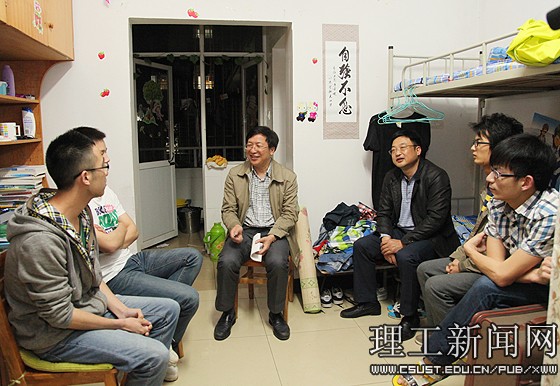 4月13日晚,校党委书记付宏渊在副校长邹宏如的陪同下,走进图书馆自习室、走进学生寝室、走进学工干部值班室,与学生、辅导员、学工值班人员面对面交流,深入问询学生学习生活情况、问询学生工作情况、问询学生意见建议,“三进三问”,把群众路线教育实践活动落实到学生心坎上。