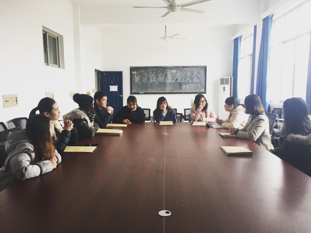1月18日上午,外国语学院于金盆岭校区9教406室召开了“实习预就业”师生座谈会,由学院就业专干刘莎主持,第一批参与“实习预就业”的11名2018届毕业生参加。
