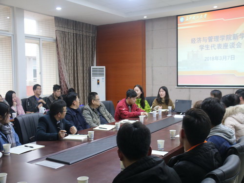 为促进校院发展,更好地为学生服务,经济与管理学院于3月7日下午在文科楼C502展开了新学期学生代表座谈会。学院党委书记王宏、党委副书记涂道勇、副院长谢朝华、全体辅导员以及各年级学生代表参加会议。