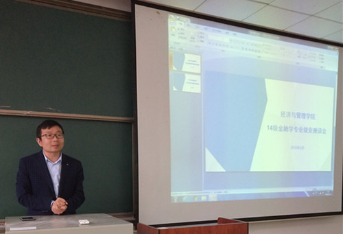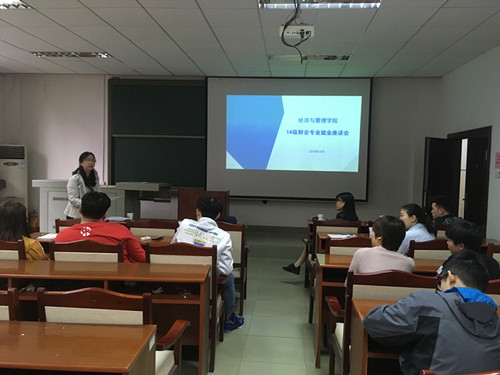 3月28日下午,经管学院在金盆岭校区7-110举行14级分专业就业座谈会。下午2:30,为14级金融专业就业座谈会。学院党委副书记涂道勇、金融系主任尹筑嘉参加,会议由院就业专干计潇主持。