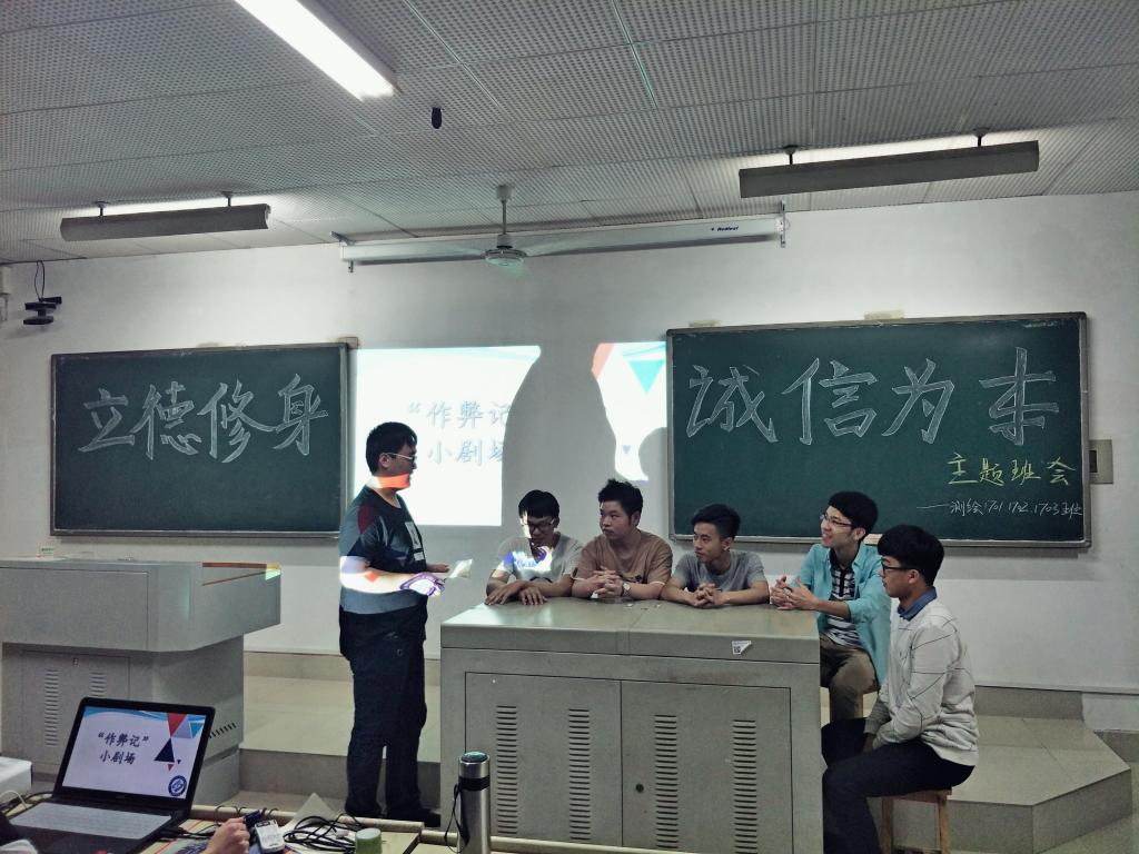班会以学生改编的模拟情景小剧场“作弊记”拉开序幕,绘声绘色的表演帮助同学们形象直观地领会了班会主题。随后,班委将与考试相关的校纪法规进行解读,组织观看《严守考纪·诚信应考》主题教育动漫短片,引发了同学们激烈的讨论测绘专业学生何美茜表示,诚信是立身之本,身为一名大学生,我们更应该严以律己,在学习生活中,争当表率,杜绝任何作弊行为。