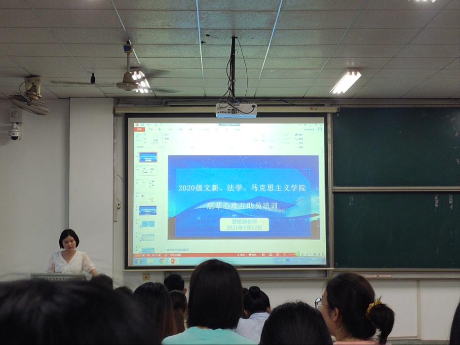 5月12日晚,马克思主义学院2020级朋辈互助员第二次培训活动在金盆岭校区13教400教室举行,本次培训会与文学与新闻传播学院、法学院联合开展,由文学与新闻传播学院心理辅导员楚艳鸽主讲,马克思主义学院辅导员曾蓓、2020级各专业负责人、寝室长、班长和副班长参加此次培训活动。