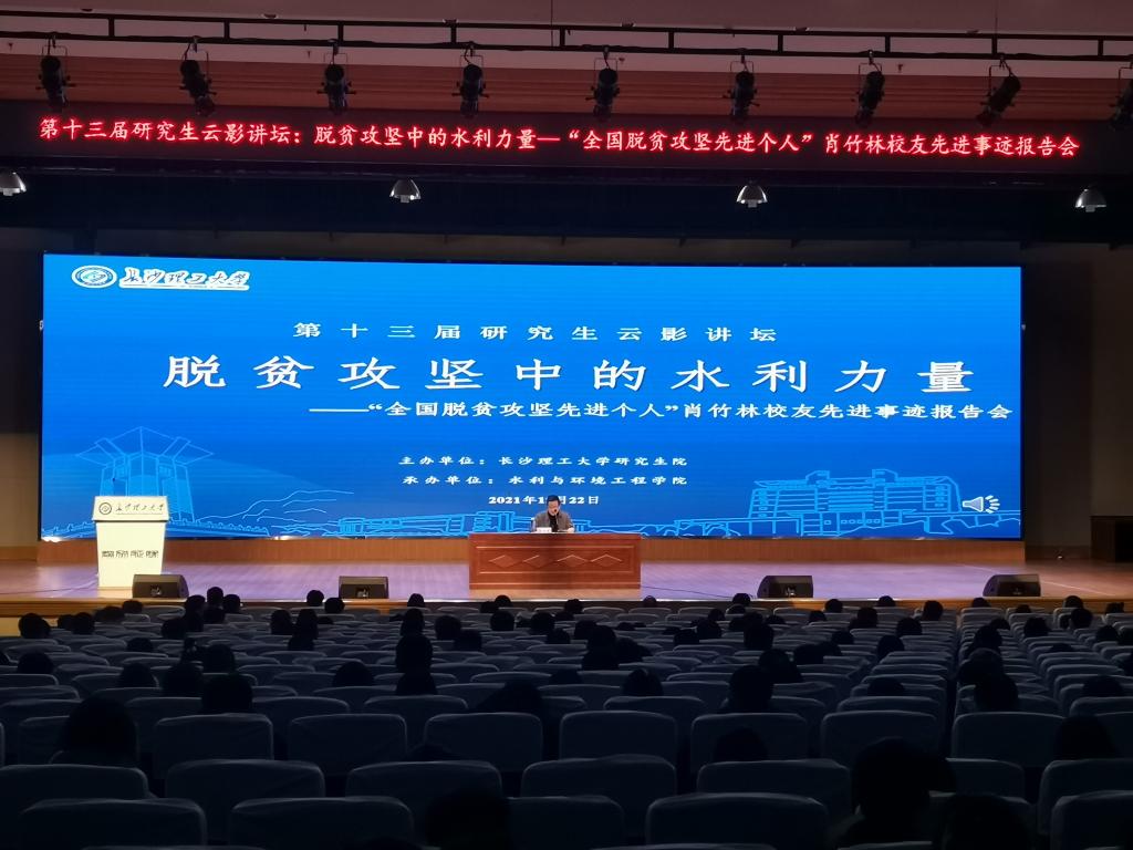 12月23日晚,由校研究生院主办,水利与环境工程学院承办的第十三届研究生云影讲坛优秀校友报告会在五教大礼堂举行。1981级水工专业校友、湖南省水利系统唯一一名全国脱贫攻坚先进个人获得者、怀化市水利局农村水利水电科科长肖竹林受邀为学院师生带来一场题为“脱贫攻坚中的水利力量”的专题报告会。水利学院副院长孙士权、专业教师毛建平、学工办主任刘灿、研究生辅导员杜丘、2021级年级辅导员綦丽以及学院500余名学生参加,活动由院党委副书记银波主持。