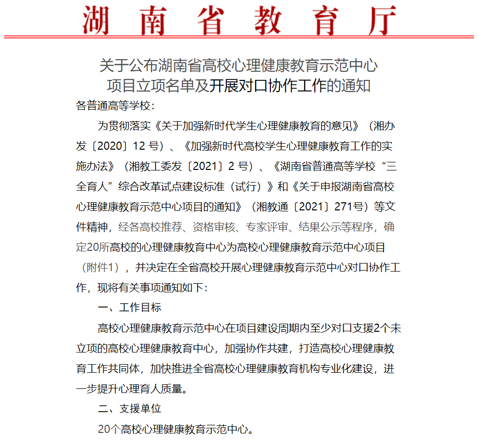为加快推进全省高校心理健康教育机构专业化建设,进一步提升心理育人质量,湖南省教育厅开展了高校心理健康教育示范中心项目,并决定在全省高校开展心理健康教育示范中心对口协作工作。经各高校推荐、资格审核、专家评审、结果公示等程序,云顶国际vip8866心理健康教育中心于2021年12月成功立项湖南省高校心理健康教育示范中心。