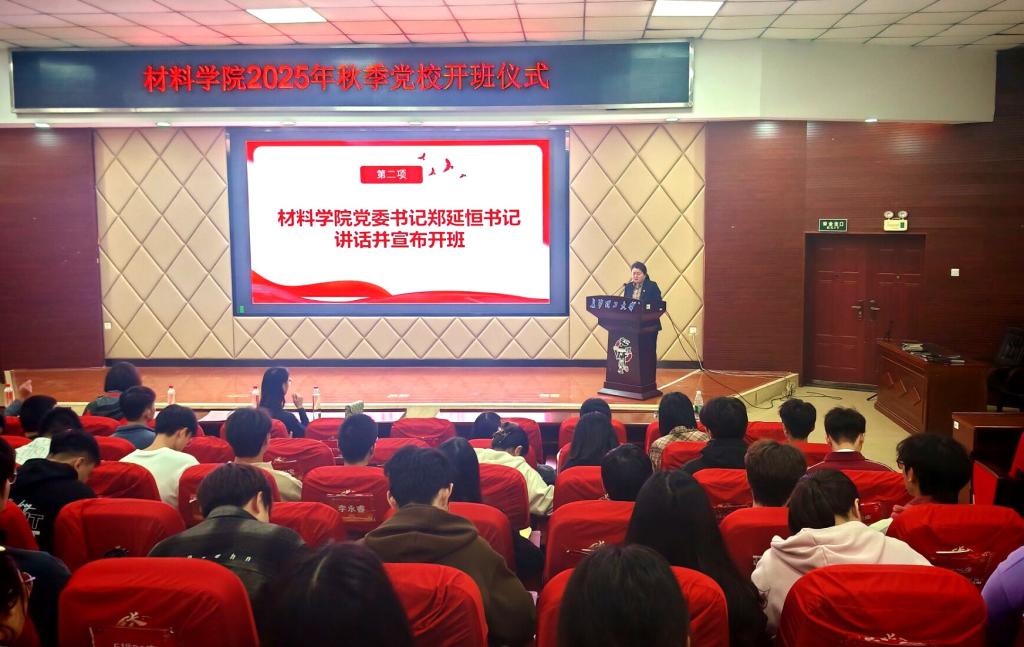10月26日19:00,材料学院2025年秋季党校开班仪式在文科楼A200举行。学院党委书记郑延恒、党委副书记邵巧艳、党建辅导员谭方林、团委书记陈飞出席仪式,全体72名党校学员参加。