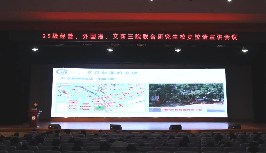 11月4日晚,经济与管理学院联合文学与新闻传播学院、外国语学院在金盆岭校区5号教学楼开展了2025级研究生新生入学教育系列活动——校史校情主题教育宣讲会,会议由云顶国际vip8866研究生宣讲团焦楚楚主讲。