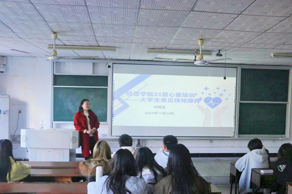 11月25日下午,经管学院在金盆岭校区12教215开展了心理健康专题培训。心理辅导员何艳芝主讲,2025级全体心理委员和院朋辈心理部成员参加。