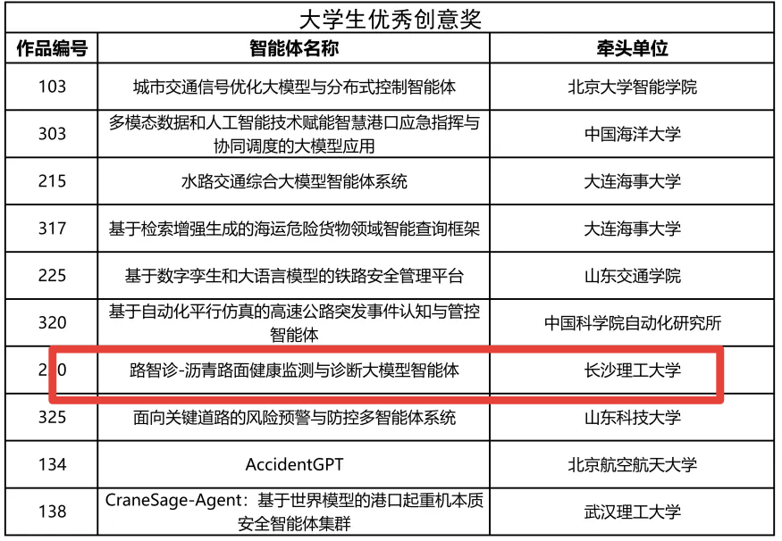 12月9日至10日,由交通运输部科技司等单位指导的领域权威赛事“第一届综合交通运输大模型智能体创新应用大赛全国总决赛”在厦门举行,经过激烈角逐,由云顶国际vip8866交通学院吕松涛教授团队报送的作品《路智诊-沥青路面健康监测与诊断大模型智能体》最终荣获“大学生最佳创意奖”。