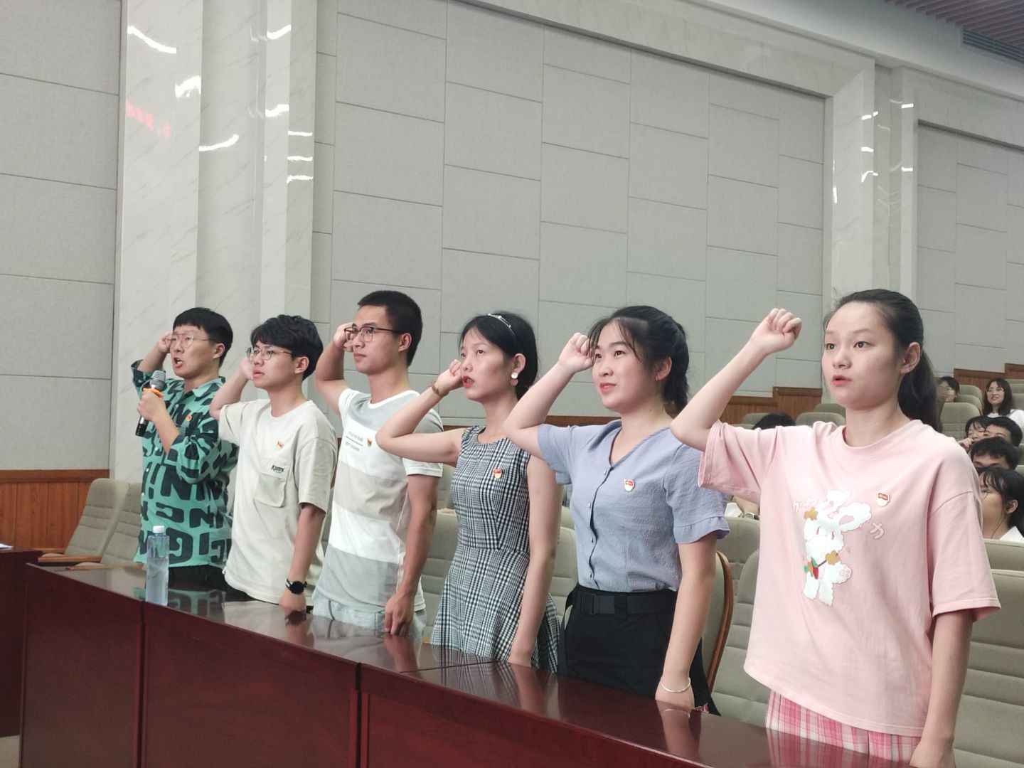 观影开始前,在场全体党员同志肃然起立,佩戴党徽宣读入党誓词,重温共产党人的初心与使命。本次观看的是纪录片《苦难辉煌》,该片高扬中国共产党全心全意为广大人民群众利益而奋斗的精神旗帜,鼓舞着全国人民实现中华民族伟大复兴的信心,生动讲述了中国共产党付出了中国历史上所有政治集团从未付出过的重大代价和巨大牺牲,最终为中华民族杀出一条血路,蹚出一条新路,使这个民族从苦难走向辉煌,给同学们带来了心灵上的震撼和精神上的洗礼。观影结束后,工作人员组织活动参与人员进行党史知识有奖问答。同学们积极踊跃地举手作答,加深了对党的理论知识的了解。