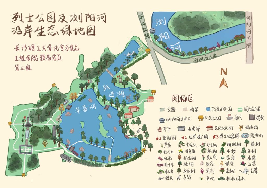 长沙市烈士公园处于浏阳河下游地区,于1959年沿河而建,植被丰富,管内陈列有全省76000多位烈士的全部名册,庄严肃穆。该学院学生党员分为两条路线对烈士公园园区、浏阳河出水口至浏阳河大桥沿河地带进行调研,在调研过程中重点记录河流、道路、植被、动物及主要建筑物等,增加指南针、道路、生物等信息以方便群众识图,根据干道当场记录植被的方式收集信息并检查是否有重要的地物遗漏。