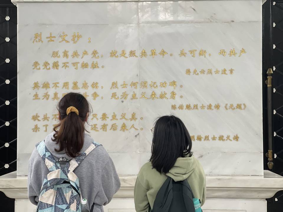 走进烈士纪念塔,不同历史时期湖南烈士的英勇事迹展现在眼前。“砍头不要紧,只要主义真”,这视死如归、大义凛然的誓言表达了共产党人对远大理想的坚贞。其实不止夏明翰同志,烈士塔内每一位烈士都有这种为真理、为理想视死如归的英雄气概,这种对革命的耿耿忠心值得我们敬仰学习。“党的百年历程中,有雷锋、李白、夏明翰这样的烈士逢山开路遇水搭桥,我们才取得如今的社会主义建设成就。”学生党员刘岸感慨道。