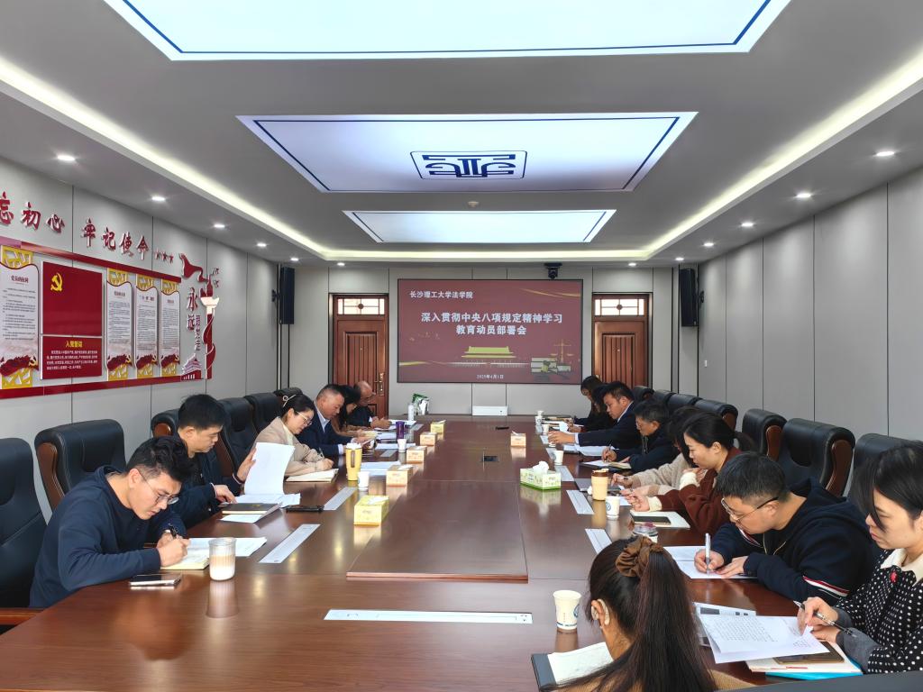 4月1日下午,法学院在金盆岭四号教学楼307会议室召开院党委会(扩大),对深入贯彻中央八项规定精神学习教育进行动员部署。会议由院党委书记龚文斌主持,院领导班子、各党支部书记、行政各办主任和系主任参加会议。