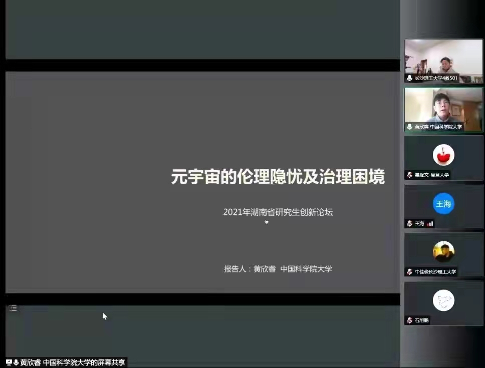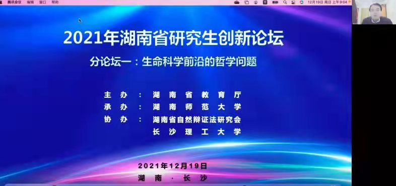 12月19日,湖南省教育厅主办,湖南师范大学承办,湖南自然辩证法研究会和云顶国际vip8866协办的“2021年湖南省研究生创新论坛——前沿科学技术的哲学反思”成功召开。本次论坛采取了线下结合线上的方式,吸引了来自中央党校、清华大学、中国科学院大学、中国人民大学、复旦大学、中山大学、武汉大学、中南大学、湖南师范大学、湘潭大学、南华大学以及云顶国际vip8866等36所高校的108名硕士研究生、博士研究生和22位专家学者一起参加五个专题共14场次的会议。马克思主义学院作为云顶国际vip8866线下分会场的组织单位,主持了其中6个场次的专题会议。