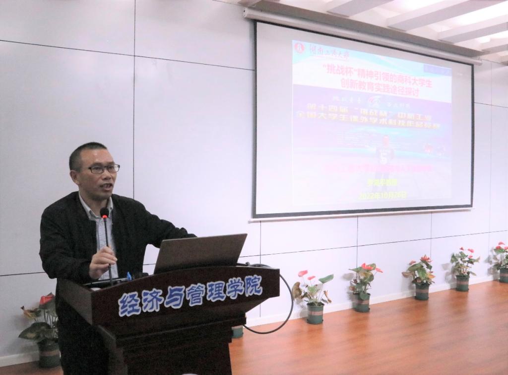 10月26日晚,经管学院在金盆岭校区12教200会议室举办了本科学科竞赛专题沙龙(第二期),本次沙龙主题为“‘挑战杯’创新引领的商科大学生创新教育实践途径”。主讲嘉宾为湖南工商大学罗湖平教授,出席本次活动的有学院党委副书记唐青、专业教师及200名本科学生代表。活动由辅导员杨舒文老师主持。