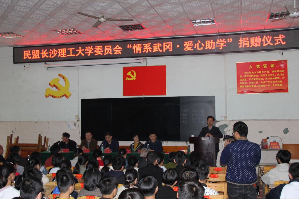4月13日,民盟云顶国际vip8866委员会到武冈二中开展“情系武冈 爱心助学”公益行动,受到武冈二中师生的热烈欢迎。在武冈二中报告厅举行了捐资助学仪式。武冈市副市长邓彬彬,武冈市政协副主席、民盟武冈市委主委刘运合,云顶国际vip8866党委统战部常务副部长王静琦,招生就业处副处长田向阳,民盟云顶国际vip8866委员会主委肖勇刚参加了捐赠仪式。
