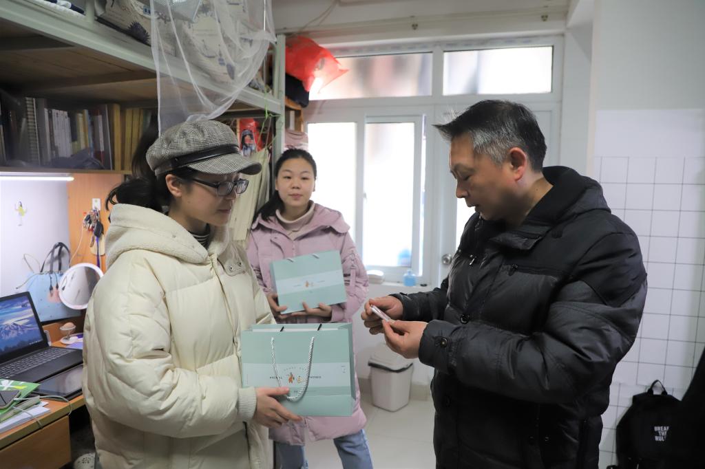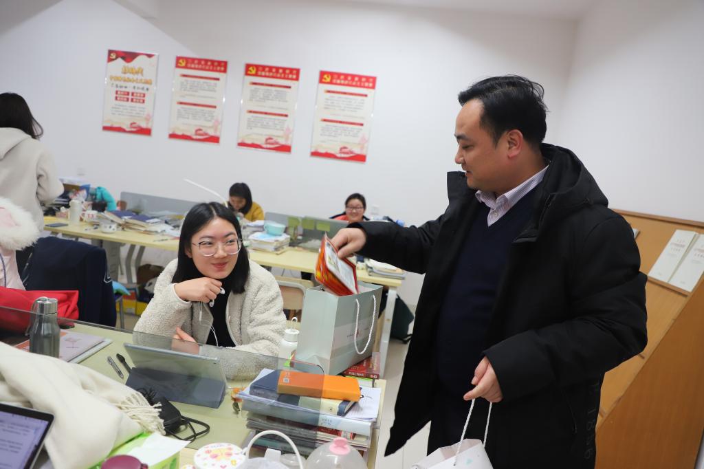 12月24日,文新系党总支书记伍接朝、副主任周云鹏在楚艳鸽等辅导员老师的陪同下,走访考研学子宿舍和自习室。系领导亲切慰问备考冲刺阶段的同学们,并送上学院精心筹备的考研“橙功”礼物。