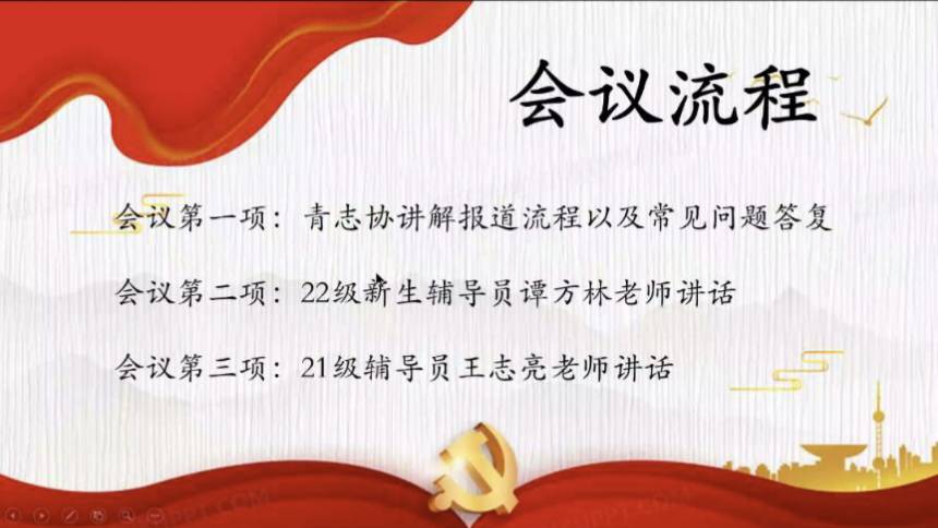 为进一步落实落细学校迎新工作安排,材料学院于8月22日线上召开2022级新生迎新志愿者培训会议,本次会议由院团学会黄慧群主持,辅导员谭方林、王志亮出席会议,60余名迎新志愿者参加。