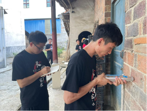 车田村地处镇平溪江畔,地形主要以丘陵为主,自建房较为分散。为了摸清家底,精准掌握检测范围和对象,博士实践团在村支“两委”的陪同下走村串户,了解车田村自建房的分布及使用情况。“房子有没有渗水?墙体有没有开裂?改建区域有没有用钢筋补强?”既是房屋安全的重要信息,也是博士实践团检测的重要依据。依据询问与排查,确定车田村30户砖混房屋作为重点检测对象。通过全站仪、水准仪、回弹仪、楼板测厚仪等专业仪器对30户自建房的材料强度、整体倾斜度、变形和沉降程度进行专业的检测和评估。同时,博士实践团对危房提出了个性化的“修缮”建议,让村民住的更安全、放心。后续博士服务团将全面总结自建房安全存在的共性问题,形成调研报告,为平安乡村建设建言献策。