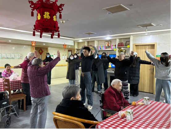随后,同学们分组开展丰富多彩的志愿活动。表演组率先登场,带全体老人练习八段锦。在舒缓的音乐声中,同学们动作规范、富有活力,老人们也认真地跟着比划。一位参与活动的爷爷感慨道:“能和孩子们一起锻炼,感觉浑身都有劲儿!”在同学们的带动下,老人们不仅身体得到了锻炼,精气神也愈发饱满。
