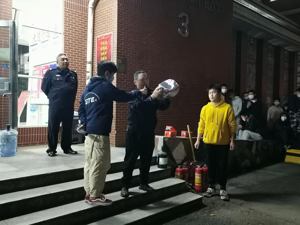 “大家在使用灭火器时,一定要注意‘提、拔、握、对、喷’五个重要步骤,特别是要注意使用前拔掉保险销,距离燃烧区域2米左右的位置,朝着火焰根部喷射……”消防演练结束后,保卫处消防科易国安就灭火器在面对不同火种时应当采取何种灭火措施进行了详细讲解,并邀请同学们现场实操使用灭火器。