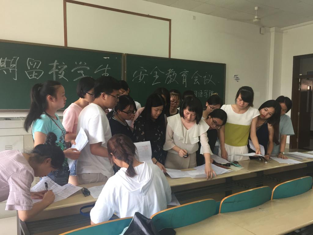 7月16日下午,外国语学院与综合教学楼A307召开2018年暑期留校学生安全教育会议。会议由学工办刘莎老师主持,年级辅导员邹磊和全体暑期留校学生参加了此次会议。