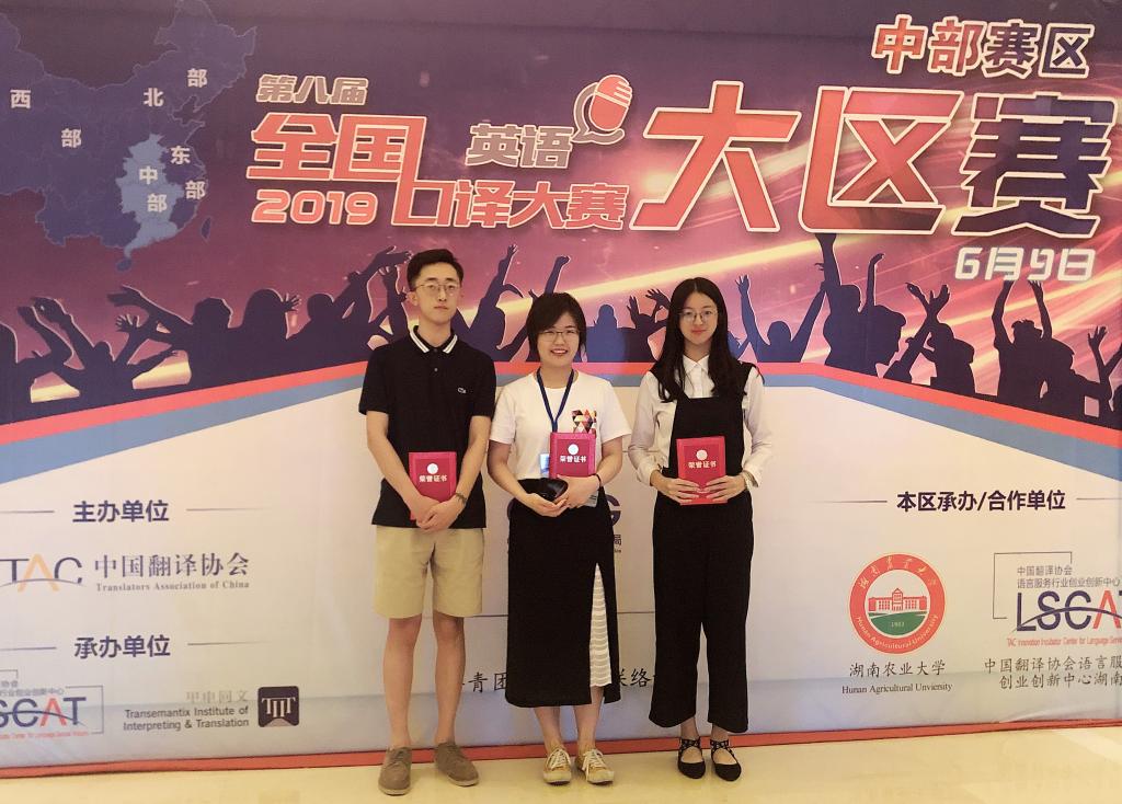 6月9日,由中国翻译协会主办的第八届全国口译大赛(英语)中部赛区大区赛在湖南农业大学顺利完赛。来自河南、湖北、湖南、江西和广东五省高校的136名优秀代表同台竞技,云顶国际vip8866翻译专业17级本科生金书琦和英语笔译专业18级研究生吴显豪夺得大赛三等奖,外国语学院毛岚荣获优秀指导老师奖。