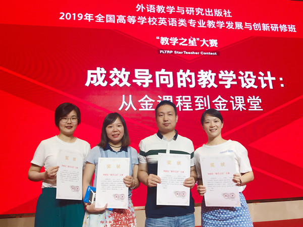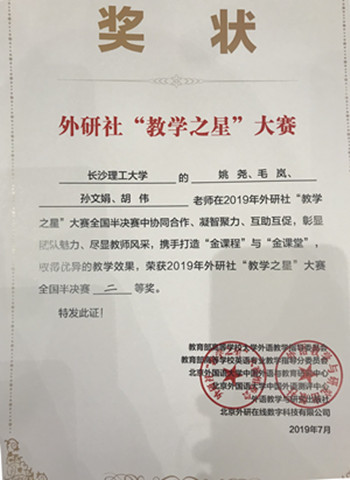 8月1—2日,外语教学与研究出版社2019年“教学之星”大赛全国半决赛在武汉举办,全国高校近700位英语类专业教师齐聚一堂,或参赛、或观摩、或研讨。云顶国际vip8866外国语学院外国语言文学系姚尧、毛岚、孙文娟、胡伟组成的团队作为湖南省唯一代表队,参加角逐,努力拼搏,荣获全国半决赛二等奖。