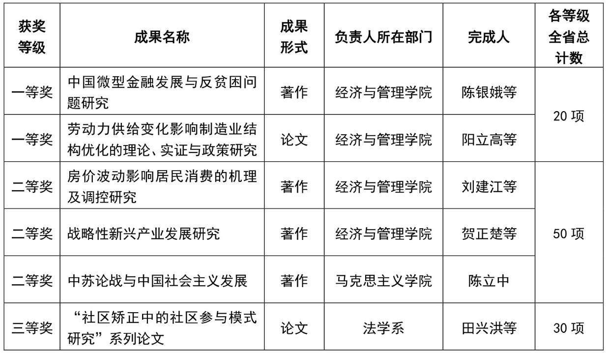 本届社会科学优秀成果奖评选中,陈银娥、何雅菲撰写的著作《中国微型金融发展与反贫困问题研究》、阳立高团队撰写的论文《劳动力供给变化影响制造业结构优化的理论、实证与政策研究》获一等奖;刘建江团队撰写的著作《房价波动影响居民消费的机理及调控研究》、贺正楚团队撰写的著作《战略性新兴产业发展研究》、陈立中撰写的著作《中苏论战与中国社会主义发展》获二等奖;田兴洪团队撰写的《“社区矫正中的社区参与模式研究”》系列论文获三等奖。