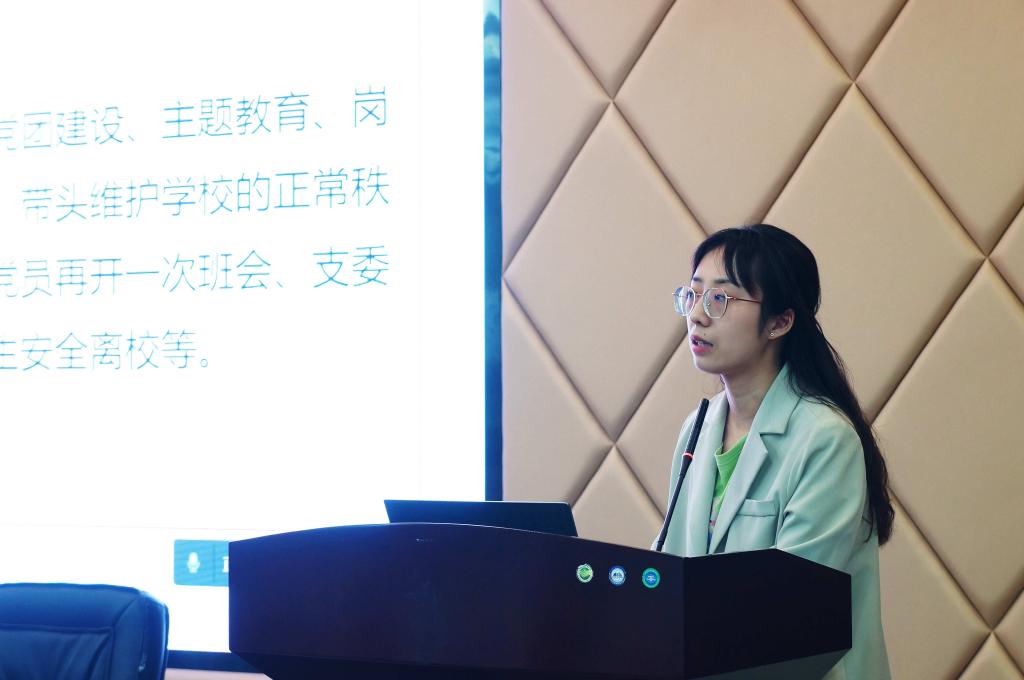 叶鑫宣读了《关于开展2022届毕业生党员离校前专题学习教育活动的通知》。她引用《党员不能成为‘花瓶’》这篇文章指出每一位学生党员都应积极该发挥自己的作用,关键时刻站出来,坚守入党初心,认真履行党员义务,对得起党组织的信任。今年围绕“十个一”开展毕业生党员教育活动,以“写好一篇思想汇报”“上好一次党课”“留下一份书香”等“十个一”专项活动为主要内容,将喜迎二十大、奋进新征程贯彻始终。叶鑫重点提到了学生党员要站好最后一班岗,并根据近期开展的“考研就业经验分享会”阐明了“最后一班岗”的实际意义。