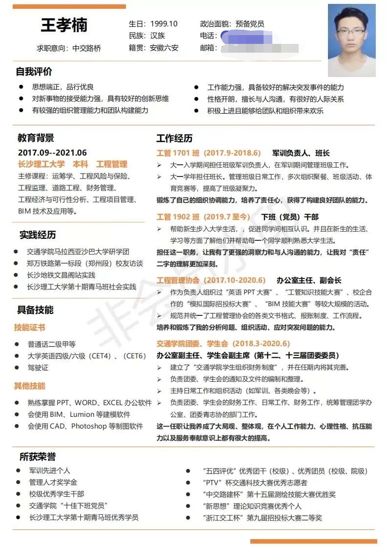 一份出色闪光的简历是毕业生必备的求职“利器”,在当前“后疫情”时期,其重要性更胜以往。此次比赛中,2021届全体毕业生主要围绕版面设计、内容结构以及表达效果等方面,结合求职目标与自身实际对简历进行了创新与完善。经专家、老师评审,道路1701班黄诗麒等5人,工管1703班张鹏等10人,交运1702班肖东翔等20人,工管1702班陈茂森等40人分别获评一等奖、二等奖、三等奖和优胜奖。不仅如此,学院还将专家、老师点评建议逐一与毕业生进行反馈,同步修改完善。