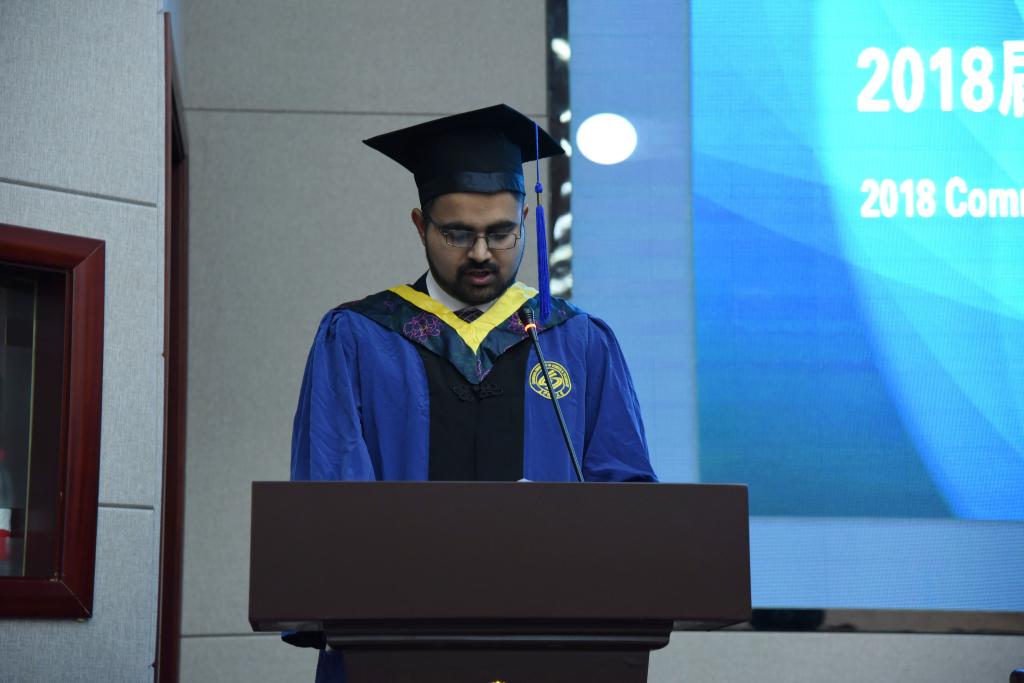 来自巴基斯坦的优秀毕业生阿力代表全体毕业生发言,表达了对学校和老师的感恩之情,表示将不负厚望,为增进自己祖国和中国之间的友好交流做出贡献。