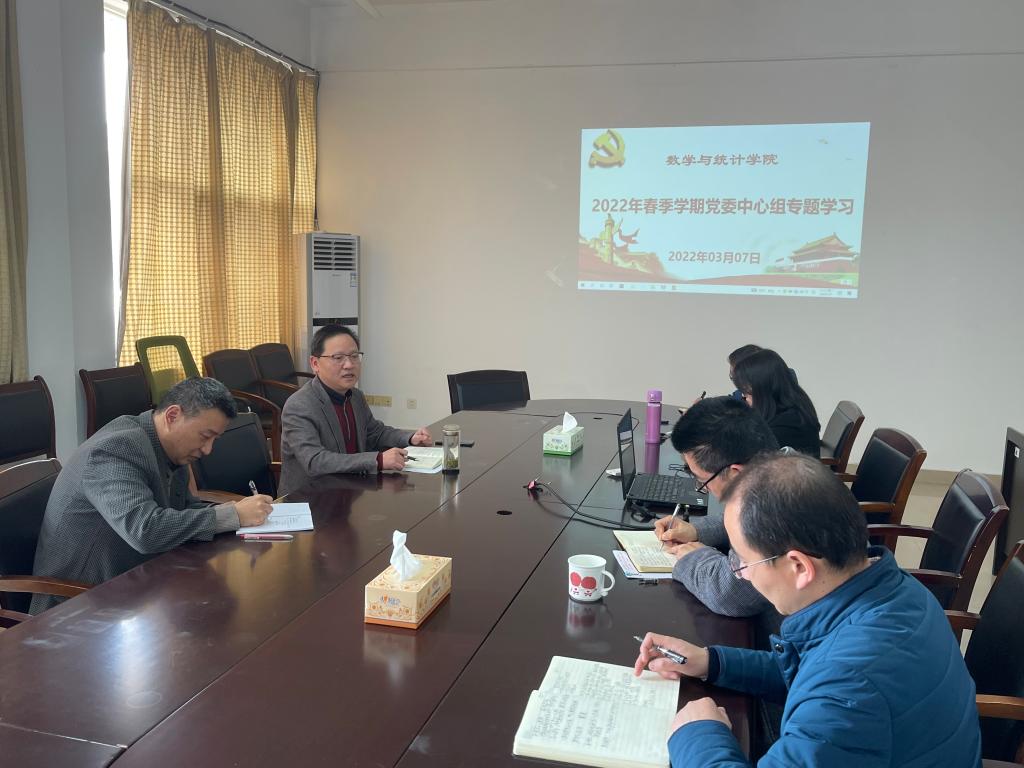 3月7日上午,数统学院党委理论学习中心组在理科楼A410举行学习会,专题学习习近平总书记在中央党校中青年干部培训班开班式上的重要讲话精神。学院党委书记邓崛峰主持并导学。